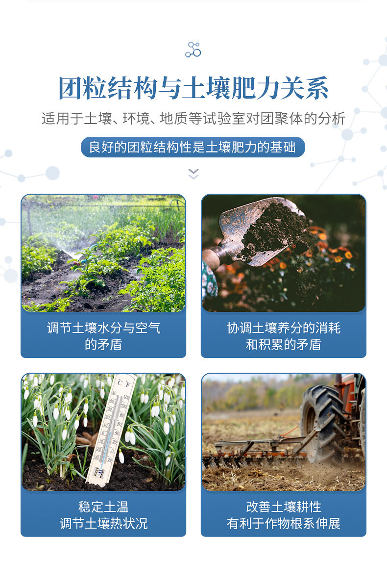 1、土壤團粒結構對土壤肥力起著重要作用。良好的團粒結構體一般應具備三方面的性質:具有一定的大小,過大或過小都對形成適當的孔隙比例不利;具有多級孔隙,大孔隙可通氣透水,小孔隙保水保肥;具有一定的穩定性,即水穩性、機械穩性和生物學穩定性。良好的團粒結構性是土壤肥力的基礎,團粒結構與土壤肥力的關系主要表現在以下幾個方面:調節土壤水分與空氣的矛盾;協調土壤養分的消耗和積累的矛盾;穩定土溫,調節土壤熱狀況;改善土壤耕性,有利于作物根系伸展。土壤團粒分析儀適用于土壤、環境、地質等試驗室對團聚體的分析。